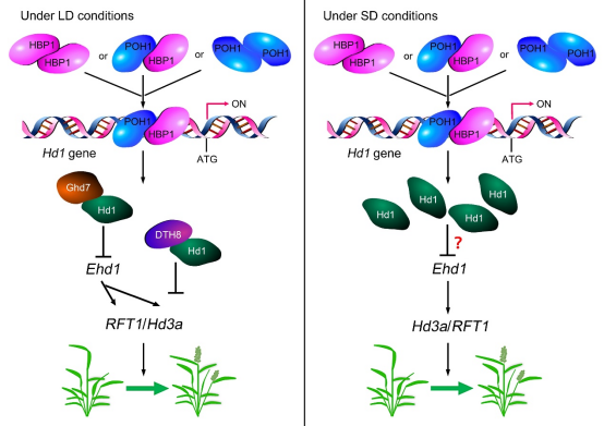 开花期是影响水稻生育期、产量、品质、地区适应性的重要农艺性状。Hd1是光周期调控水稻开花期的关键因子,但是调控Hd1的分子机制尚不十分清楚。团队研究发现,Hd1 Binding Protein 1 (HBP1) 和Partner Of HBP 1 (POH1) 是含有basic Helix-Loop-Helix结构域的转录因子,可以相互作用,形成同源或异源二聚体,直接结合Hd1启动子,激活Hd1基因表达,从而调控水稻开花期。遗传分析表明,超表达HBP1和POH1提高Hd1的表达,降低Ehd1、Hd3a和RFT1的表达,使水稻开花期延迟。hbp1的CRISPR/Cas9基因编辑突变降低Hd1的表达,提高Ehd1、Hd3a和RFT1的表达,使水稻开花期提前。研究揭示了HBP1和POH1通过Hd1调控水稻开花期的分子和遗传机制,为深入研究调控Hd1的分子机制,拓展水稻开花期调控的基因网络,开展水稻不同生育期的品种选育奠定了理论和实践基础。